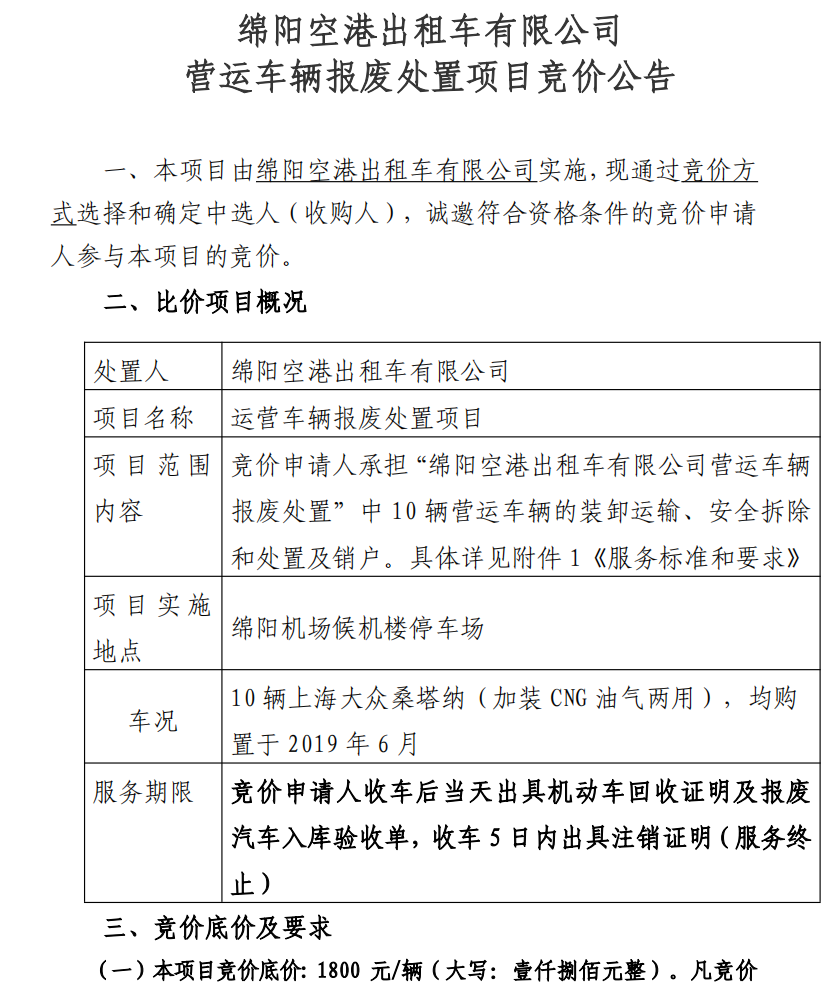 綿陽(yáng)空港出租車(chē)有限公司營(yíng)運(yùn)車(chē)輛報(bào)廢處置項(xiàng)目競(jìng)價(jià)公告