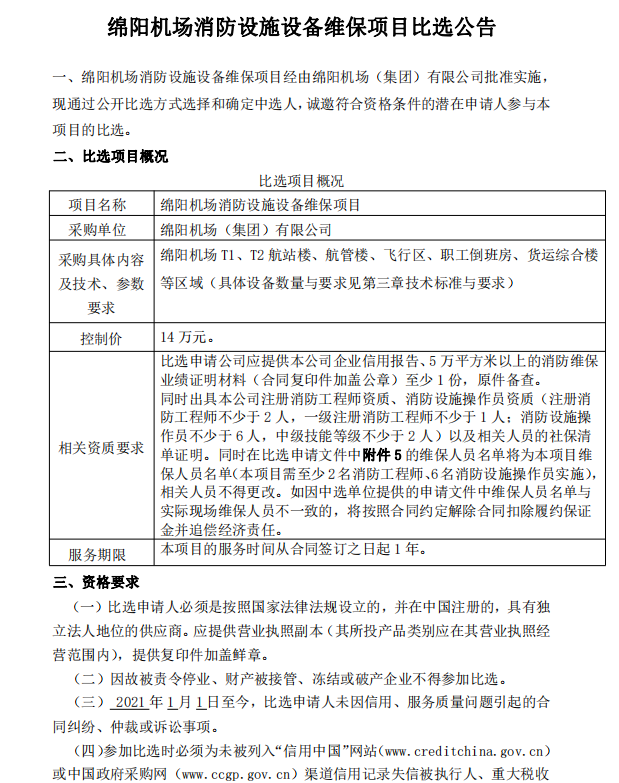 綿陽機場消防設施設備維保項目比選公告