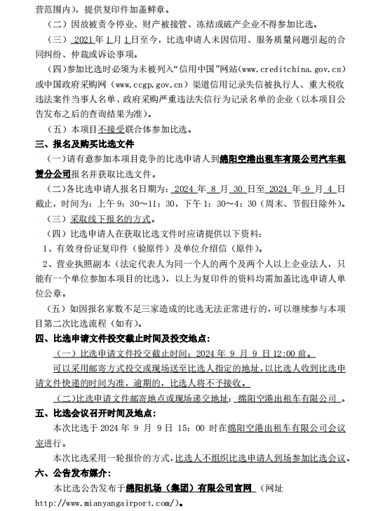 綿陽空港出租車有限公司汽車租賃分公司車輛采購項目比選公告