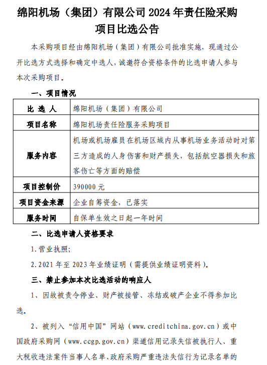 綿陽機場(集團)有限公司2024年責(zé)任險采購項目比選公告
